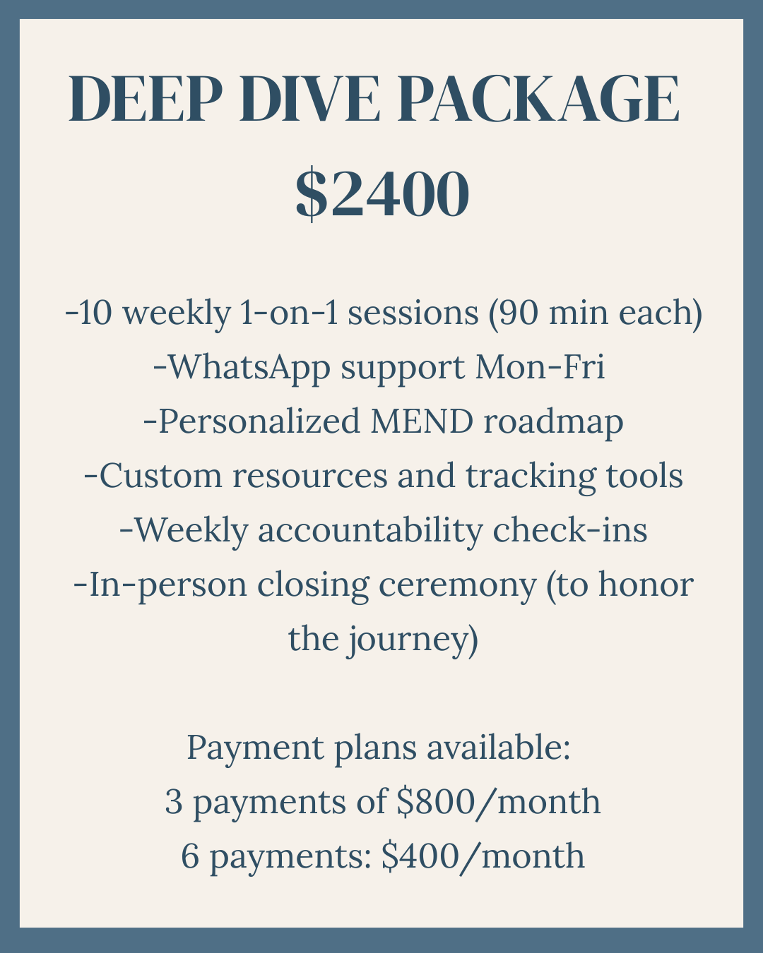 We can always extend, add sessions or upgrade to the Deep Dive. But let's start with 6 weeks and see how you feel. Most clients are amazed at how much changes in that time.