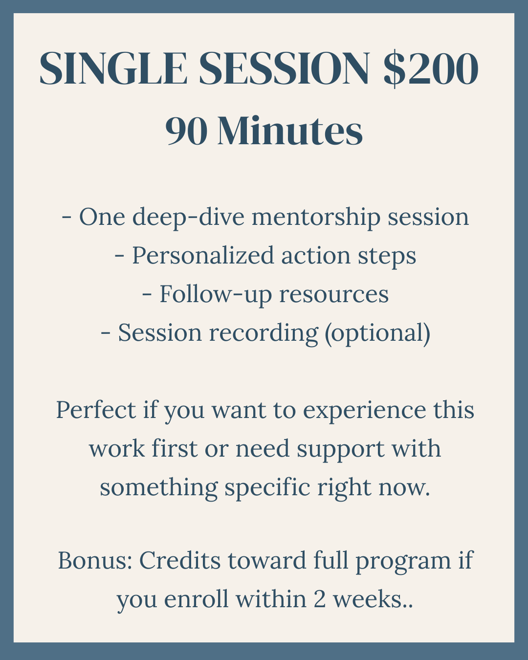 I believe every woman deserves support, regardless of financial circumstances. I offer 1-2 scholarship spots per quarter at 50% off for women experiencing genuine financial hardship.